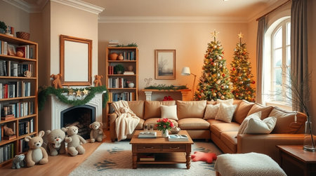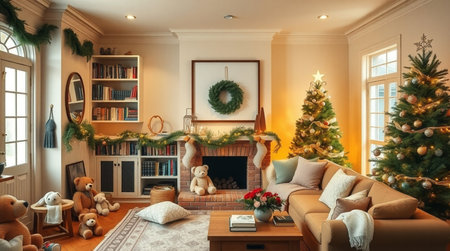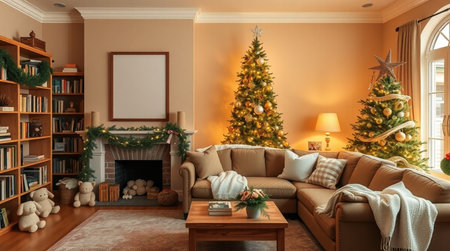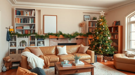 A beautifully decorated living room featuring a warm and inviting atmosphere, complete with a lit Christmas tree, soft cushions, and festive decorations for the holiday season.
