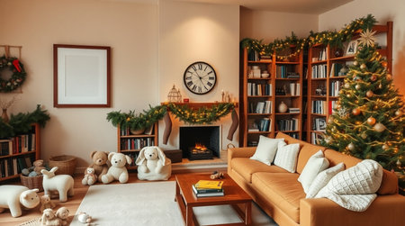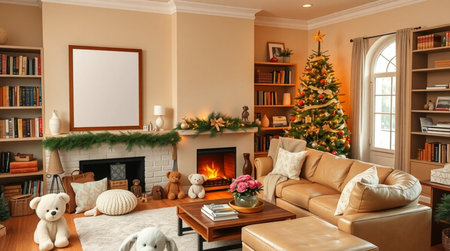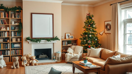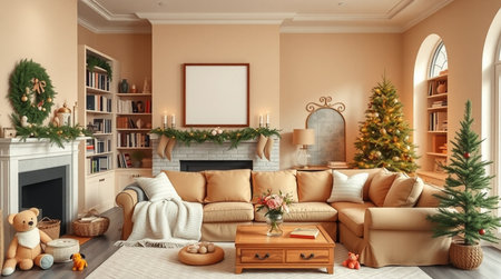 A comfortable American room with beige walls, a vertical frame mockup, evergreen garland, and golden Christmas tree lights.