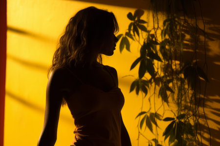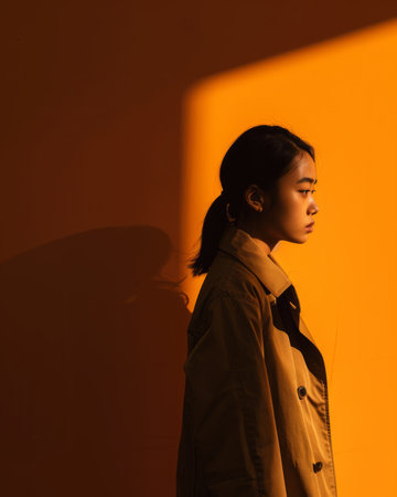 A woman stands still beside a wall, her profile illuminated by the warm, soft light of late afternoon. Shadows dance gently around her, creating a calm atmosphere.