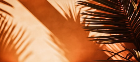 Soft palm leaf shadows on warm brown wall creating abstract tropical nature background pattern.
