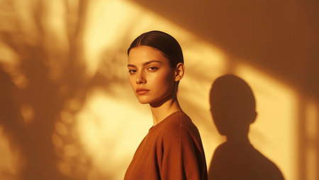 A model stands still in a well-lit room where warm light creates soft shadows on the walls. She gazes softly into the distance while dressed simply in light clothing.
