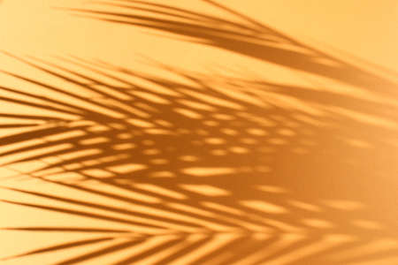Shadow of leaf tree on orange background. Sun day. Overlay, copy space.