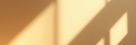 An abstract composition of warm golden sunlight casting geometric rectangular shadows on a textured wall and floor. The interplay of light and shadow creates a minimal and calming aesthetic suitable for backgrounds.