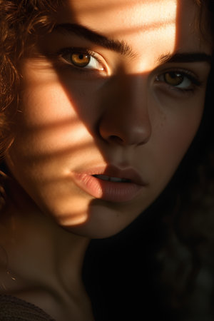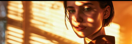 A woman stands in a sunlit room, her profile illuminated by soft light. Stripes of shadow created by blinds dance across her face, adding depth to the serene scene.