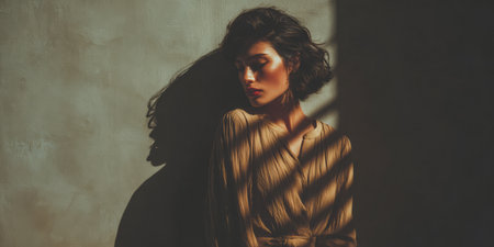 A woman stands gracefully in a softly lit room, casting expressive shadows on a textured wall. Her thoughtful pose and gentle attire enhance the scene's artistic nature.