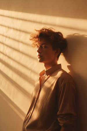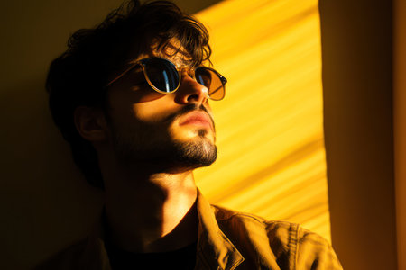 Male figure with curly hair is bathed in warm sunlight, creating dramatic shadows on his face against a colorful wall, enhancing the visual atmosphere and emotion, AI generated
