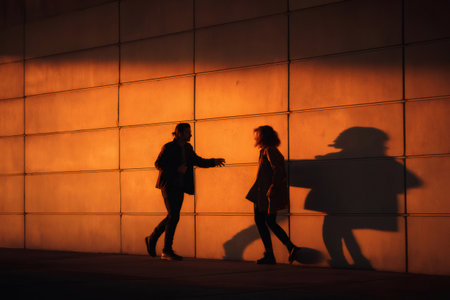 Young couple enjoying playful moments while creating fun shadows on an orange wall during a beautiful sunset, radiating joy and togetherness