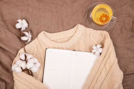 Autumn background, a cup of hot drink in female hands and a knitted plaid