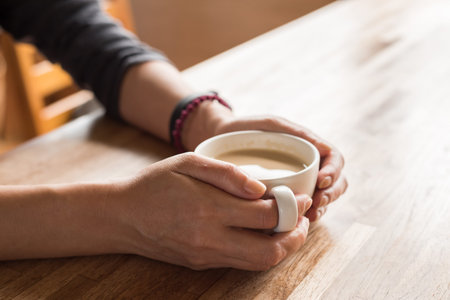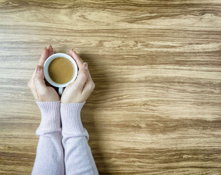 Girl holding a cup of coffee or hot chocolate or chai tea latte. Quiet hygge time concept. Warm tone. Horizontal, wide screen format