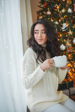 Beautiful young dark-haired woman in a knitted sweater with a mug of hot cocoa and marshmallow near the Christmas tree. Stylish curly model near the window. new year.