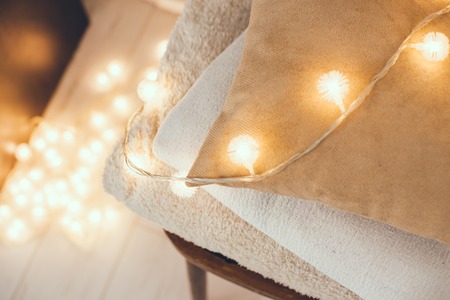 A stack of white and beige pillows and blankets with string lights on vintage wooden chair. Cozy interior details, soft and warm home decor.