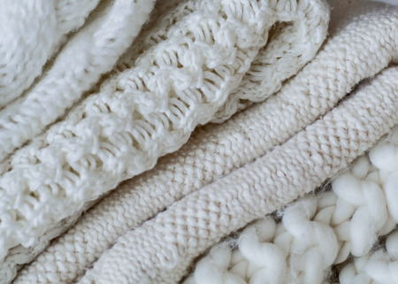 Knitwear, fabric textures and handmade items concept - Warm knitted clothes, soft and white