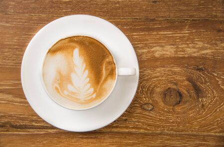 Hot coffee cappuccino latte spiral foam on dark wooden background