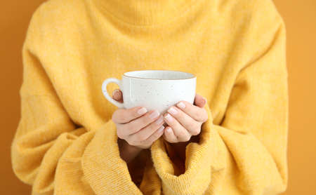 Beautiful young woman in warm sweater and with hot tea on color background, closeup
