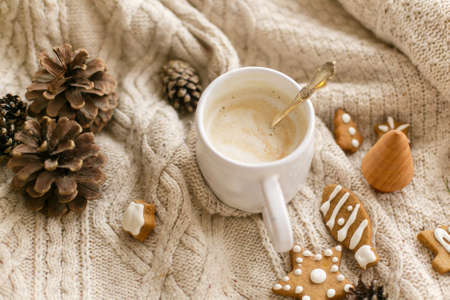 Warm coffee on background of cozy knitted sweater with christmas gingerbread cookies and pine cones. Atmospheric winter hygge. Happy Holidays