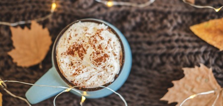 Mug of coffee, cocoa or hot chocolate with whipped cream and cinnamon on scarf with leaves, garland. Pumpkin latte - cozy drink for cold fall or winter.