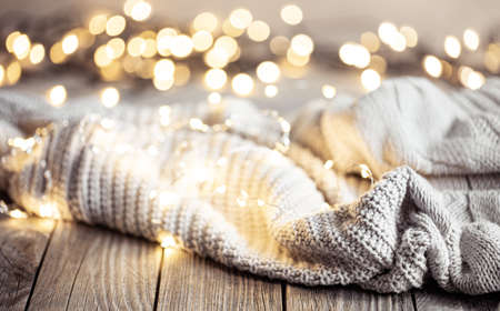 Cozy winter composition with knitted element and blurred background with bokeh.