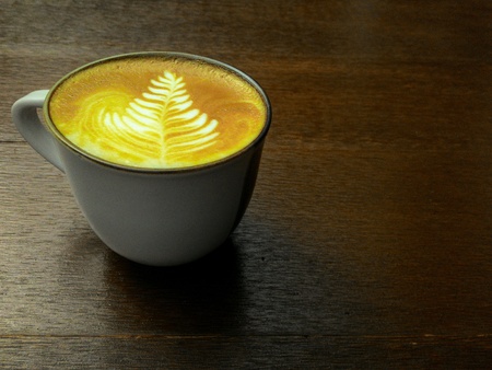 Latte Leaf Angle on the left The background is out of focus on the coffee.