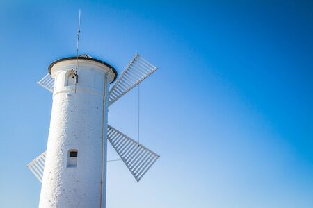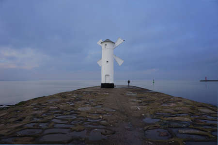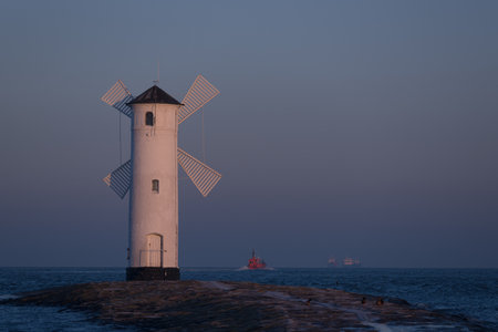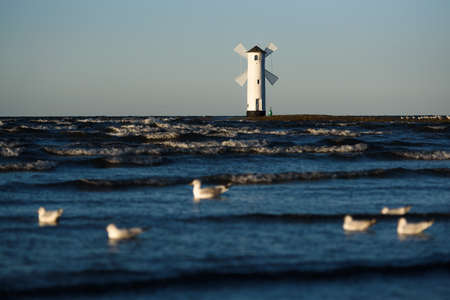 Seascape with lighthouse looks like windmill. Swinoujcie in Poland.