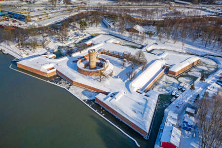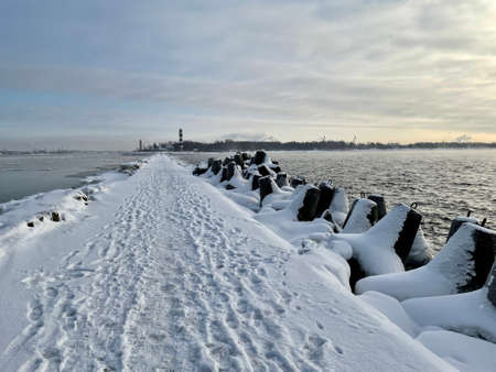 Snowy view of Povorotny lighthouse, Vikhrevoi island, Gulf of Finland, Vyborg bay, Leningrad oblast, Russia, winter sunny day with blue sky, lighthouses of Russia travel