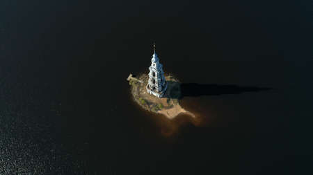 Kalyazin flooded Bell Tower from drone. Aerial view of Kalyazin, Russia. Russian orthodox architecture on the Volga River. Сhurch in the middle of the river