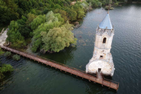 Aerial view of The fish cathedral. Sunken church ruins located in the Ebro reservoir in Cantabria, in the north of Spain. High quality photo