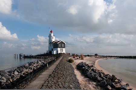 Seascape. A decorative lighthouse stands on a peninsula surrounded by calm water in the sun.