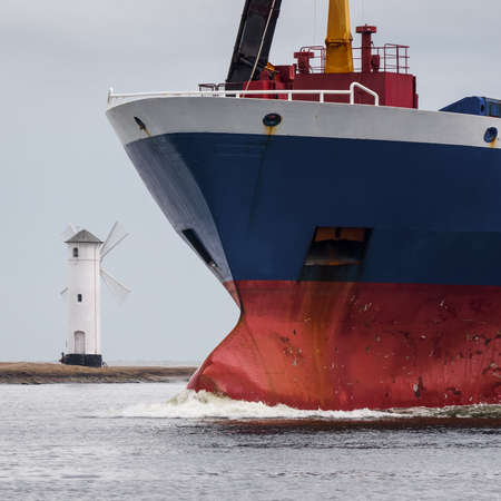 SEA COAST - Stawa Mills navigation sign and a ship on the waterway to the port at dawn