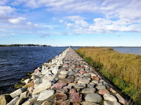 A beautiful view of the stone pathway leading to a lake in Wyspa Sobieszewska, Poland
