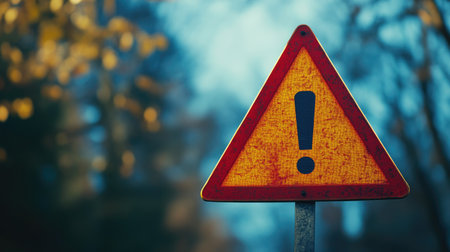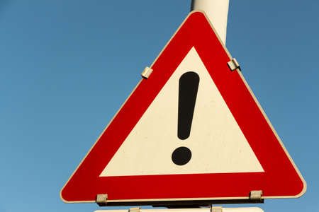 Caution sign black triangle with exclamation mark on bright yellow, alerting drivers to be careful in traffic.