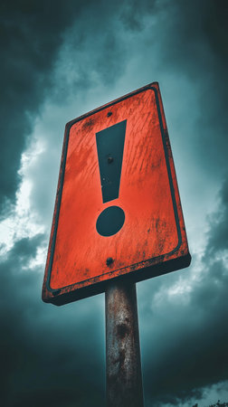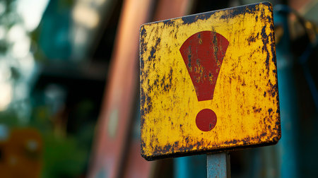 A striking warning sign featuring a bold exclamation point against a clear blue sky, symbolizing danger and safety awareness for various outdoor settings.