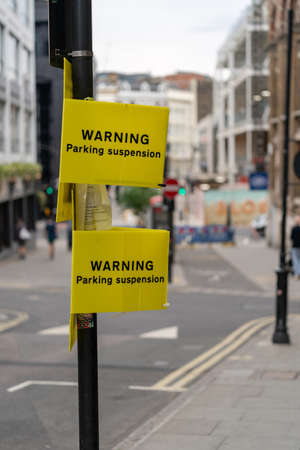 LONDON, ENGLAND - JUNE 3, 2020: Car parking signs indicating restrictions warnings and suspensions during the COVID-19 pandemic lockdown in Farringdon, London, England - 071