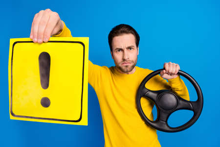 Portrait of attractive serious guy holding steering wheel exclamation sign warn isolated over bright blue color background