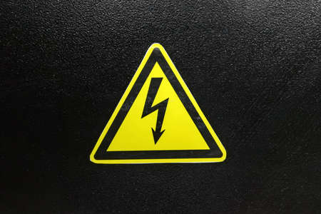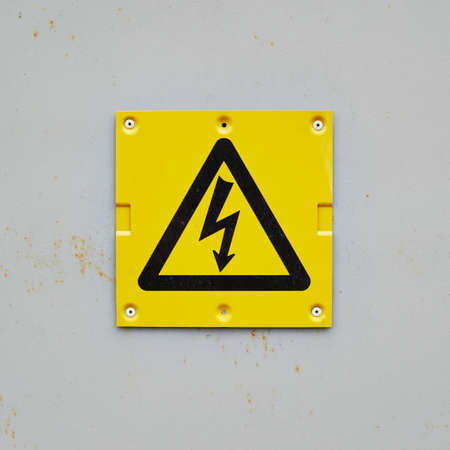 Close up of old Gray Hinged Power Supply Box with yellow danger warning sign electricity in remote places damaged