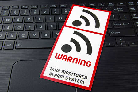 The word warning is written from wooden cubes. A photo was taken in spot light on a red background.