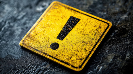 A bright yellow warning sign with a bold exclamation mark, placed on a clean black background.