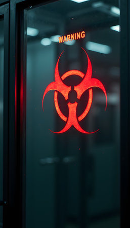 Biohazard symbol and warning text glowing red on a laboratory door, indicating danger and risk