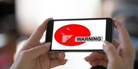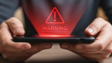 A hand holds a smartphone displaying a red holographic warning symbol and the word 'WARNING'. It illustrates digital security, online threats, data protection, and mobile alerts. Crucial for cyber safety.