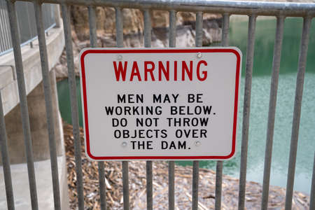 Sign reminding tourists for the Buffalo Bill Dam in Cody Wyoming not to throw items, as men are working