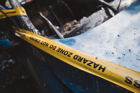 London | UK - 2021.06.12: An abandoned, stolen burnt out blue car parked on the sideway parking spotб tied with yellow do not cross stripe