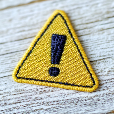 A yellow features patch an exclamation mark designed to signify caution and alertness for safety purposes.
