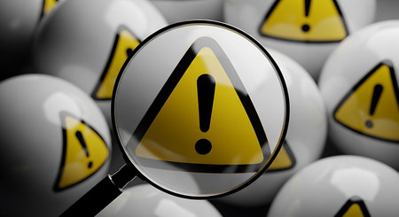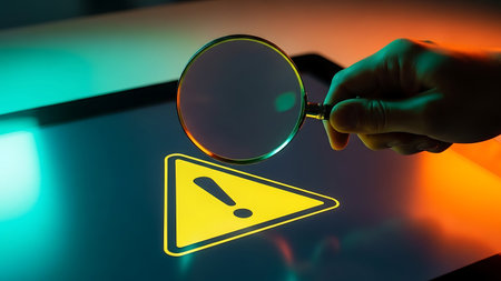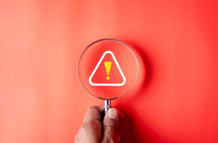 A magnifying glass focuses on a bright orange warning sign with a black exclamation mark inside a triangle.