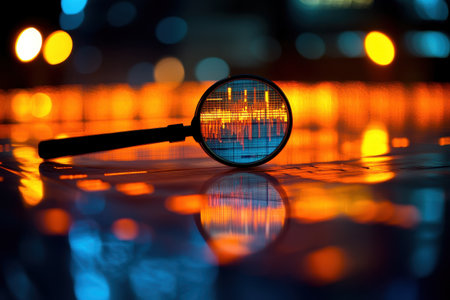 Magnifying glass highlighting digital data, bokeh lights, technology, futuristic, analytical scene.