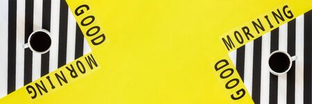 Text Good morning and cup of coffee on stylish black and white napkin on yellow background . Concept Flat lay Top view Copy space Banner.