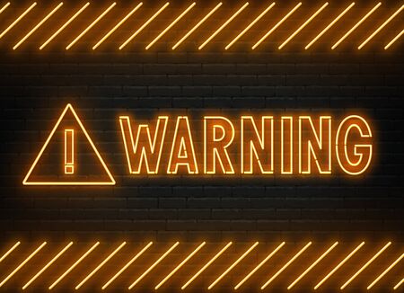 Warning neon sign on dark background .