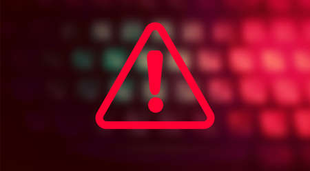 A bright red neon warning sign in the shape of a triangle with an exclamation mark, set against a blurred background of red lights and abstract technological elements.