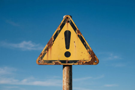 A striking warning sign featuring a bold exclamation point against a clear blue sky, symbolizing danger and safety awareness for various outdoor settings.