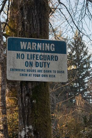 old weathered no lifeguard on duty sign posted on a tree at a nearby park