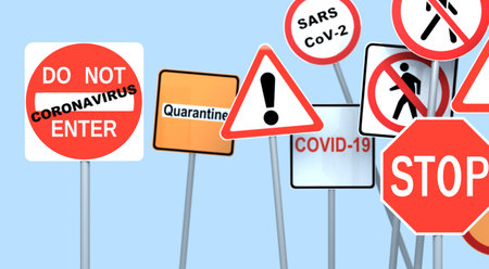 Set of coronavirus covid-19 quarantine biohazard warning and prohibition signs. Black, red and yellow design. Epidemic and Pandemic Warning. Various shapes.