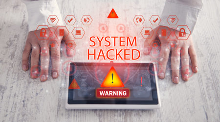 Cybersecurity breach alert on a laptop screen showing “system hacked†warning message, concept of data protection, cyber attack, hacking, computer security risk, and information safety crisis.